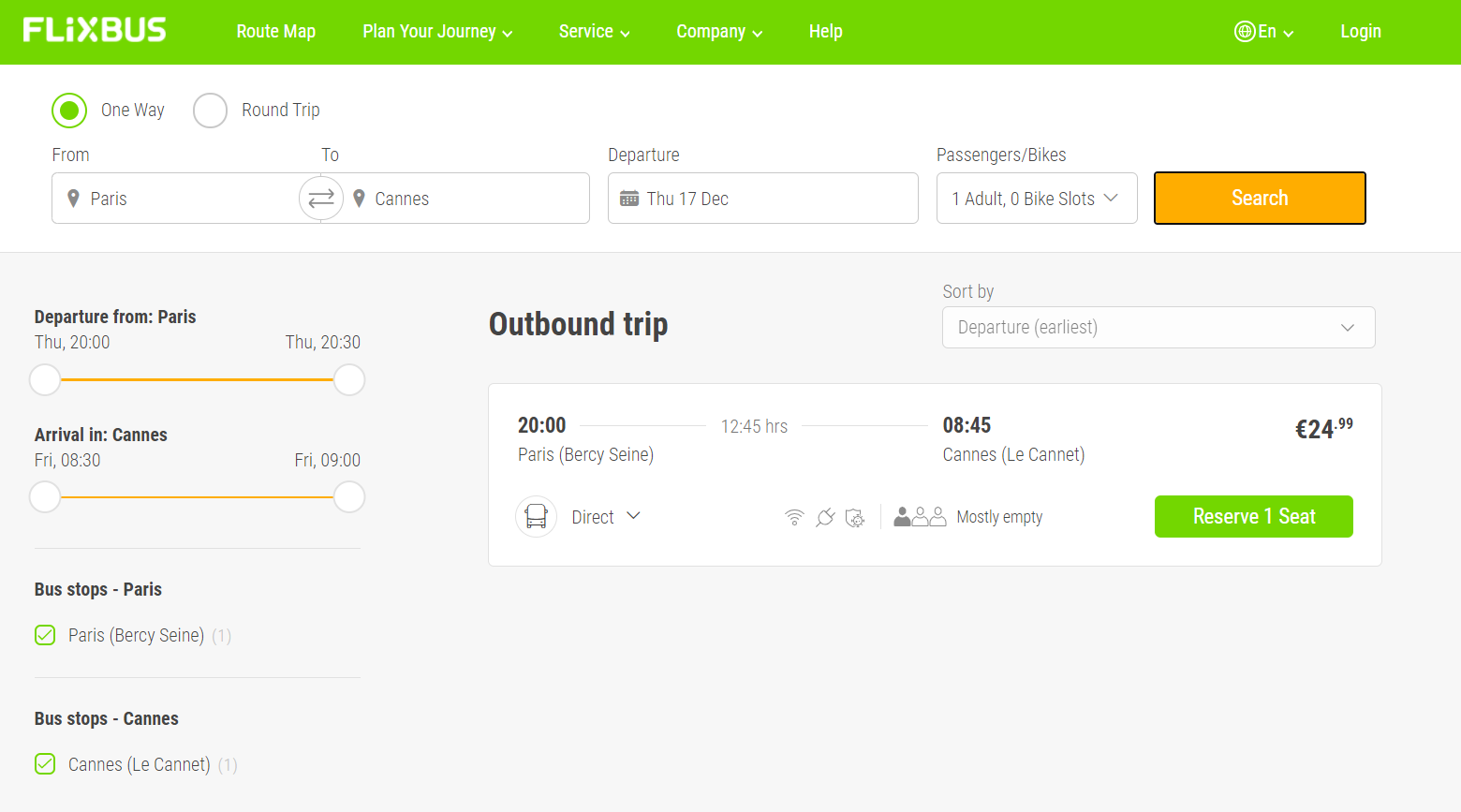 파리에서 칸까지 야간버스티켓값은 29.9유로